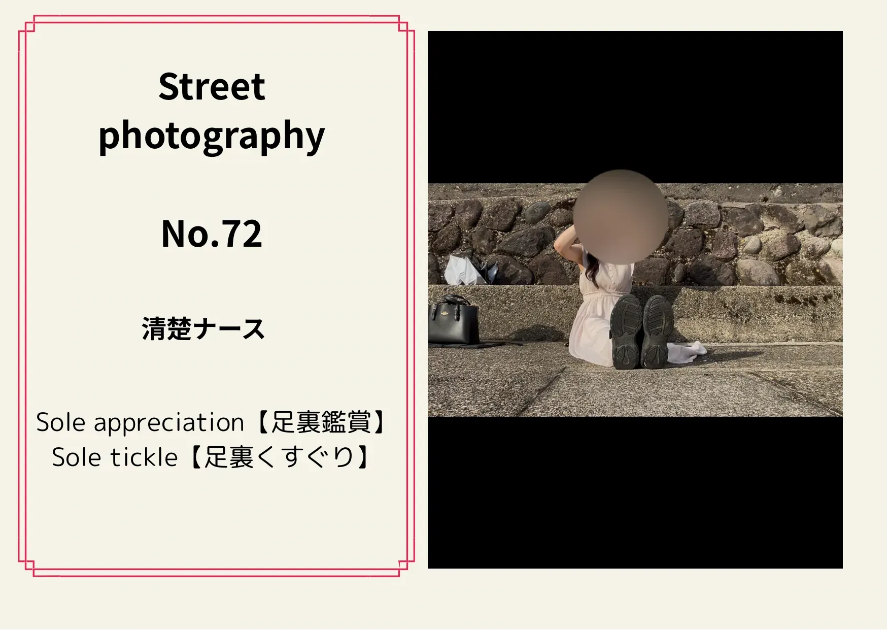 《 街撮りNo.72 清楚ナース》 【足裏鑑賞】【足裏くすぐり】 ╰(*´︶`*)╯154cm 23.0╰(*´︶`*)╯ 観光中の 美人さんを撮影してきました(^^) お顔だし🆗な清楚ナースを撮影✨ 対応してくれました! 約10分 2499pt くすぐりをしっかりしています笑 審査後アップ予定です^ ^ 是非ご購入お願いします✨
