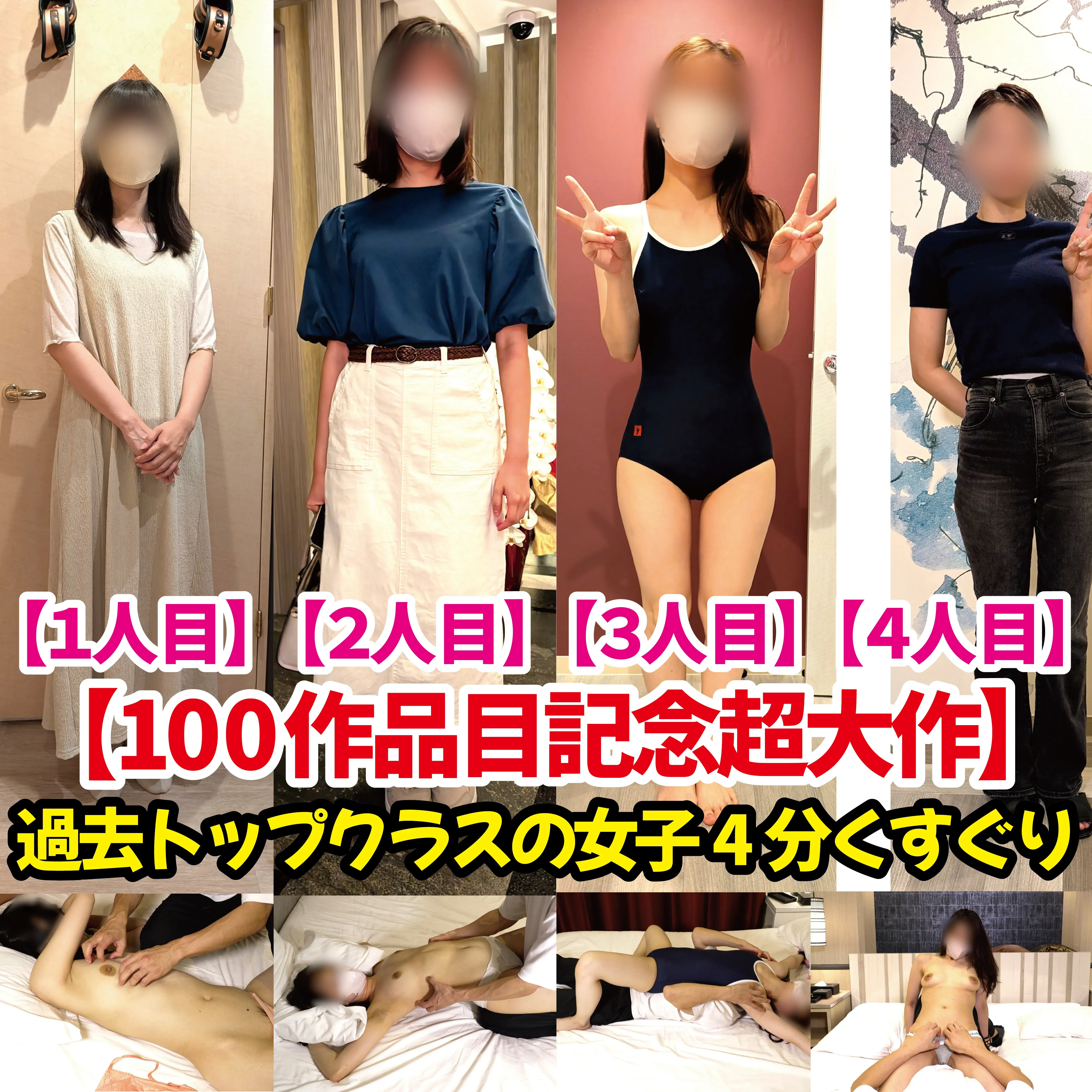 【100作品目記念超大作】過去トップクラスの女子4人分くすぐりプレイ 今作でついに100作品目となりました、ありがとうございます。 記念超大作ということで過去トップクラスの激弱、美人、反応、可愛さを揃えた超大作となっています。 〇過去トップクラスの女子4人分収録 〇公開直後のみ半額〈50%OFF〉 〇収録時間4時間over それぞれ1作品〈各作最低60分以上〉傑作に仕上がって単品販売もしていますが、〈完全版〉は4人分を各作品を単品で買うより【お得な価格】になっています。 しかも公開直後【期間限定】で〈完全版〉のみ半額〈50%OFF〉で大サービスで公開しています、少しでも興味あるならお早めに! ※こちらは〈完全版〉の販売ページです。 【1人目】~連日残業続きの超敏感スレンダーOL~(1時間8分) 1ヵ月半くらいかけてプレイをスケジュールを組んでいたのですが、「ごめんなさ急遽仕事が入って、、」「次の土曜も出勤なんです、、」と 激務なOLを貴重な休日に呼び出してバチこちょした一部始終を収録しています。 スタイルもいいし、声も反応も一見の価値アリの傑作、雰囲気は坂道系アイドルのような子 【2人目】~彼氏持ちの快感雄叫びの社会人2年目女子~(分) 彼氏持ちだけどくすぐりフェチを彼氏には恥ずかしくて言えず悶々とした日々を過ごしていた社会人2年目女子からプレイをお誘いを受けてバチこちょ 感度高めで声も荒げて感じています、特に背中からお尻が性感帯でくすぐったさと快感でおかしくなっています、イクシーンも収録済み スクール水着も着させて感度をさらに高めて快楽に溺れさせてます、自然に声や反応が出てしまい見てる側もかなり興奮する傑作です 【3人目】~育ちの良いお嬢様の気持ちいい快楽多めプレイ~(1時間4分) 見た目は清楚で可愛さ、まだあどけなさなが残る女子、でもちゃんとカラダは大人の反応をするお嬢様 この子のカラダの肉付きが男子から1番人気かも、さわさわこちょこちょ乳首責めクリ責めなど快楽多めの作品 人気の鼠径部+クリくすぐりも収録、この子の見どころシーンはスクール水着を着させて乳首乳輪こちょこちょシーン、感度がマックスに上がり淫らな姿を披露しています 【4人目】~スタイル抜群くすぐり激弱美女~(1時間2分) 最後は相変わらずスタイル抜群のくすぐり激弱美女の最新作、プライベートでガチでカルバン・クラインの下着を着用してる子(今や衣装のイメージが強い) カルバンのモデルにもいけそうなモデル級のスタイルの女子を全身くすぐり、オイルでにゅるにゅる、臨場感抜群の手持ちアングル、ヘッドマッサージャーで最後にとどめを刺してフィニッシュ、ありがとうございました。 この1作品だけでも元は取れますよ 以上4人分をまとめた〈完全版〉とそれぞれ4人の〈単品販売〉があります。 当たり前ですが〈完全版〉は公開直後のみ【期間限定】で半額〈50%OFF〉で公開するので2作品の価格で傑作4作品分見ることができるのでます、 明らかに〈完全版〉がお得です。100作品目の超大作、ぜひお楽しみください。 ※ごめんなさ超大作なので見放題プラン対象外です、それぞれ単品販売でご覧ください。 ・ご本人さんの許可を得ています。ご本人さんから削除依頼が来た場合は予告無しで削除します。 ・女性の個人情報やTwitterのアカウントに関する質問にはお答え出来ません。 ・本編マスク着用し顔ボカシを入れています ・全裸や本番行為はありません。 ※あくまでもフェチプレイ動画です。 ・二次使用、譲渡、転載、転売等は禁止します。 ・発見した場合、顧問弁護士を通じ法的措置を取ります。