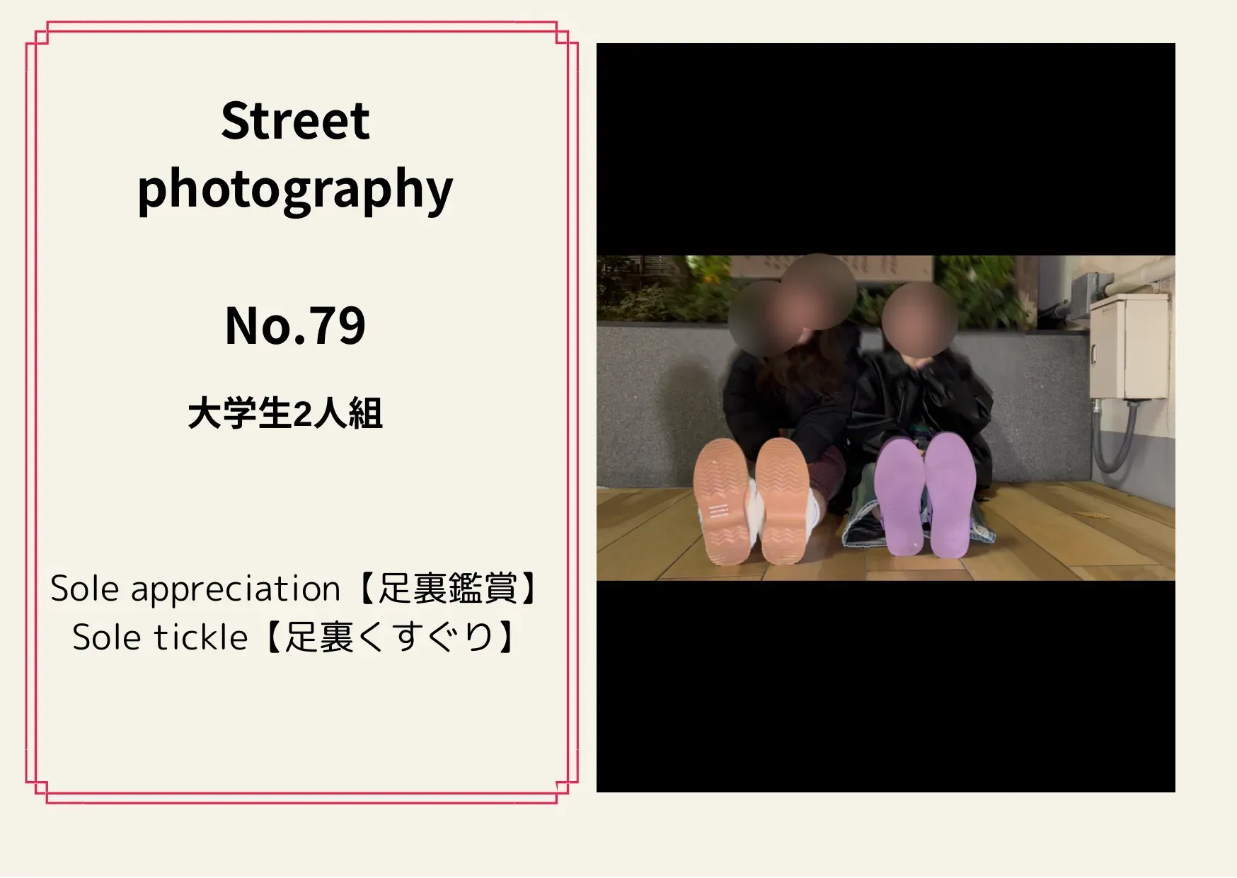 《 街撮りNo.79 女子大生2人組》 【足裏鑑賞】【足裏くすぐり】 約13分 2499pt わたしの中では神回となってます! わりと人気なくすぐり我慢1分対決を 二人分収録されてます^ ^ ちなみにどちらかの子は耐えられず、 ふっかるに1分しこたま、 街中でこちょこちょされました笑 こちょこちょ好きな方は 満足していただけるかと 思います╰(*´︶`*)╯♡ 是非こちらの作品ご購入 お願いします!!!