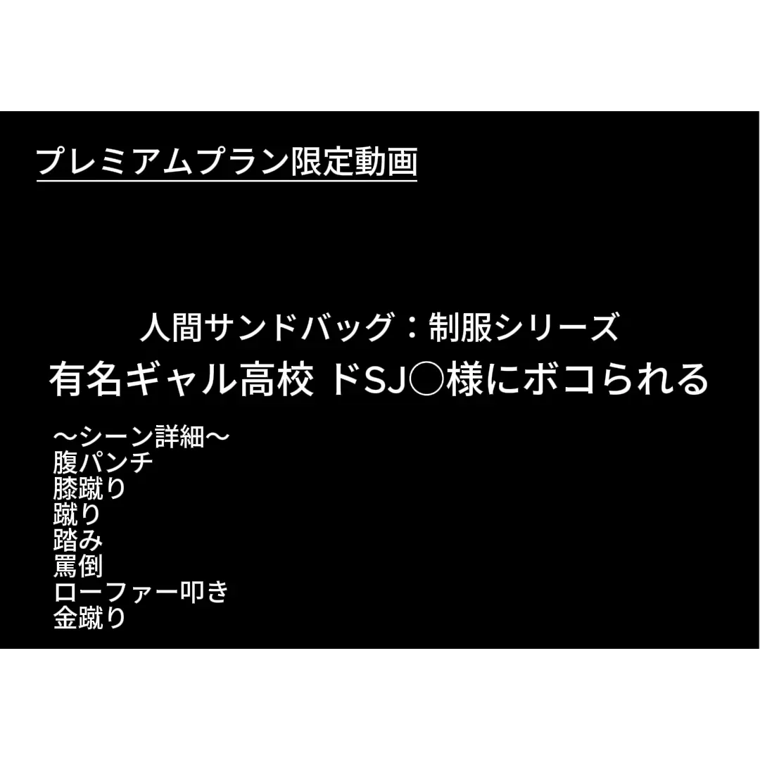 人間サンドバッグ:制服シリーズ ムチムチ〇Kにボコられる ムチムチ豊満ボディーの女子○生にボコボコにされます。 驚いたことに、Xでいきなり、「男ボコるの好きなので殴られてくれませんか?」とDMがきました。。 さすがにこんなDMがくるとは夢にも思わず、情けないながら興奮してしまったのを覚えております。 殴り、蹴り、踏み、全部やりたいとのことで〇K様の言いなり通りサンドバッグとなりました。 最後は制服を脱がれたお姿でボコってきます。 ムチムチ豊満ボディーに体重を掛けられると内臓までめり込んでしまいそうで苦しいです。