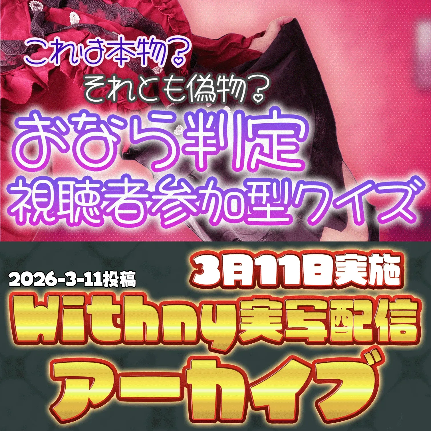 2026-3-11 🍒実写配信アーカイブ(3月11日配信)🍒 【withny実写】本物?偽物?おなら判定クイズ 『今の音、絶対本物でしょ!』ってコメントが流れるたびに、画面の裏でニヤニヤしちゃった(笑) ------------------------------- "🍒Live Stream Archive (March 11th)🍒" "Real or Fake? The Fart Guessing Quiz" "Every time a comment popped up saying, 'That one was definitely real!', I couldn't help but smirk behind the screen. (lol)"