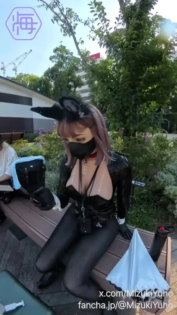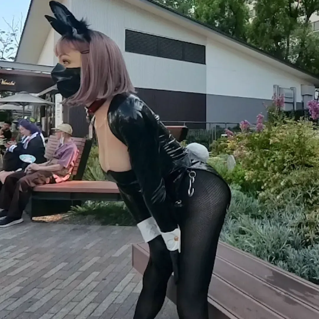 バニースーツ姿のうみつきさんが屋外のイベント会場でバテている様子です。 [2409_plan01-03] [フィメールマスク] [コスプレ] [屋外] [ソロ] [撮影] [バニースーツ] [イベント]