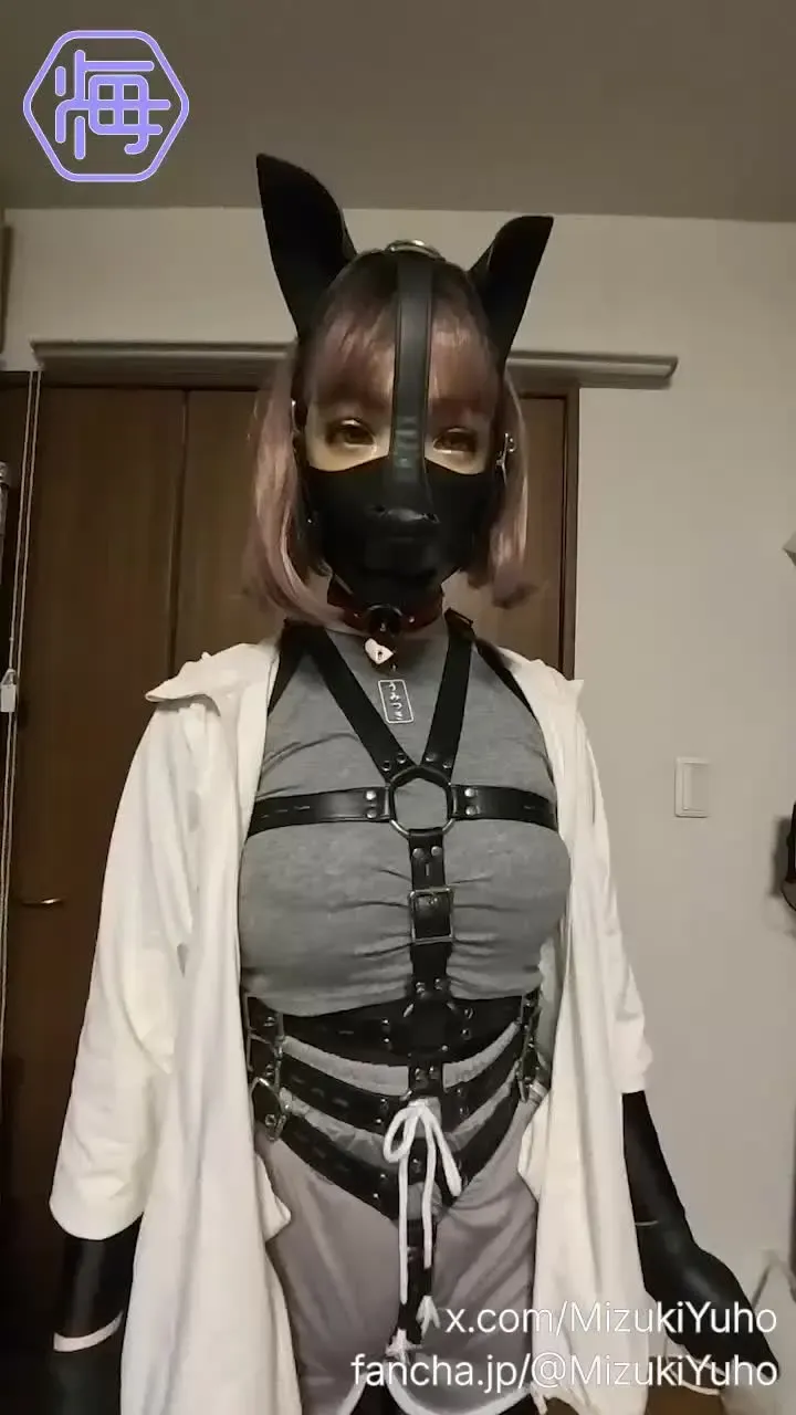 服の上からハーネスとドッグマスクを着るうみつきさんの様子です。 [ChangeClothes] [フィメールマスク] [ゼンタイ] [屋内] [ソロ] [撮影] [ドッグマスク] [呼吸音]