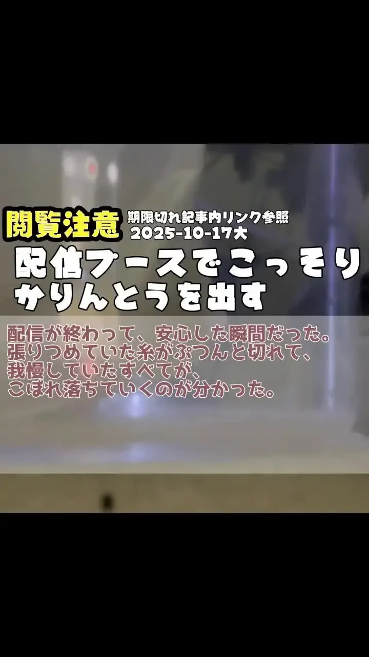 2025-10-17大 [配信ブースでこっそりかりんとうを出す] 配信が終わって、安心した瞬間だった。 張りつめていた糸がぷつんと切れて、我慢していたすべてが、こぼれ落ちていくのが分かった。 ------------------------------- [Sneaking out some karinto in the streaming booth] It was the moment after the stream ended, when I finally relaxed. I could feel the taut string snap, and everything I'd been holding back just spilled out.