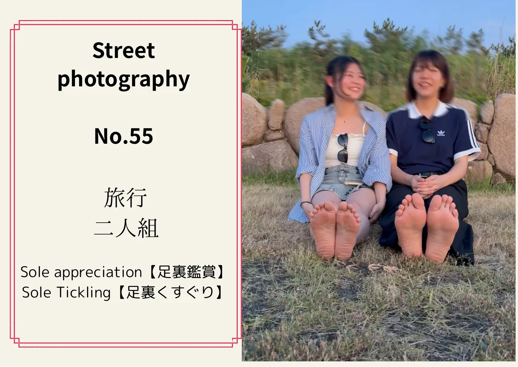 《街撮りNo.55 仲良し2人組》 【足裏合わせ】 次に足裏合わせも撮影できました! 幼馴染らしくそんな2人でも足裏は みた事がなかったみたいで じっくり見せ合っている姿は 素晴らしいシーンになりました笑 是非こちらもご購入お願いいたします🤲
