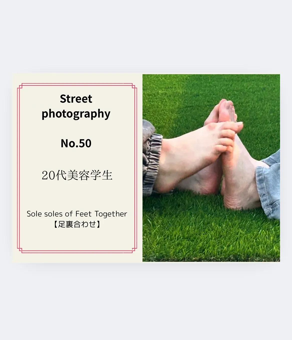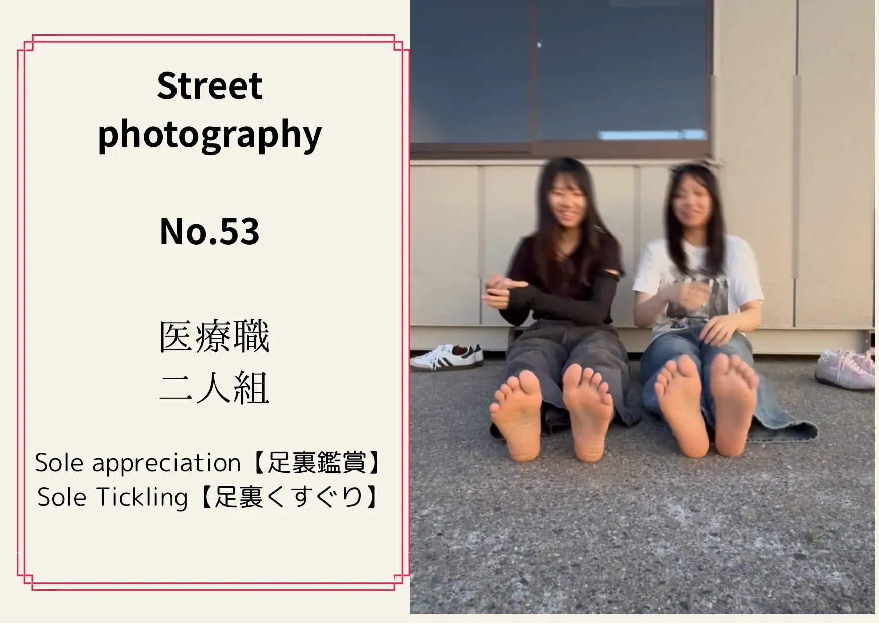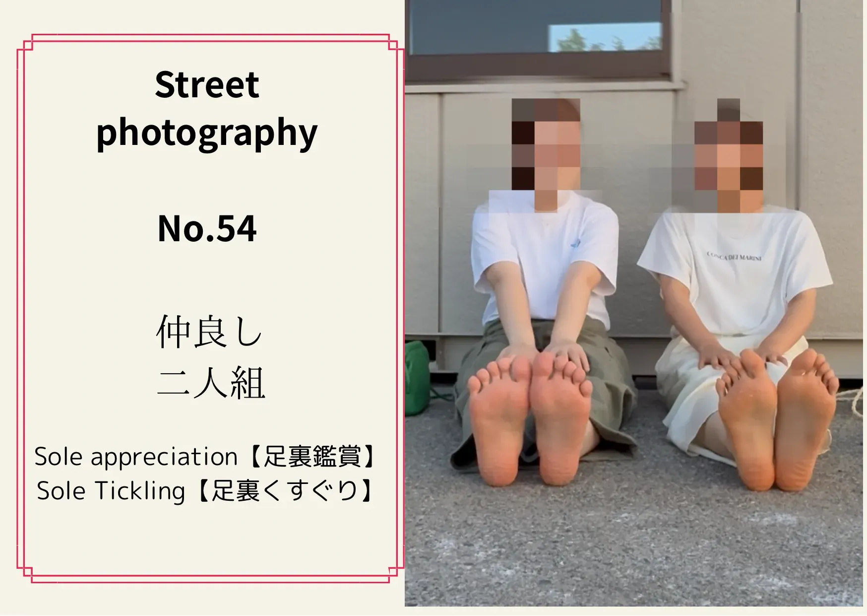 《街撮りNo.54 仲良し2人組》 【足裏合わせ】 次に足裏合わせも撮影できました! 足裏を見せ合うシーンは シュールさにふたりとも大爆笑でした笑 たしかにシュールですよね。。。笑 是非こちらもご購入お願いいたします🤲