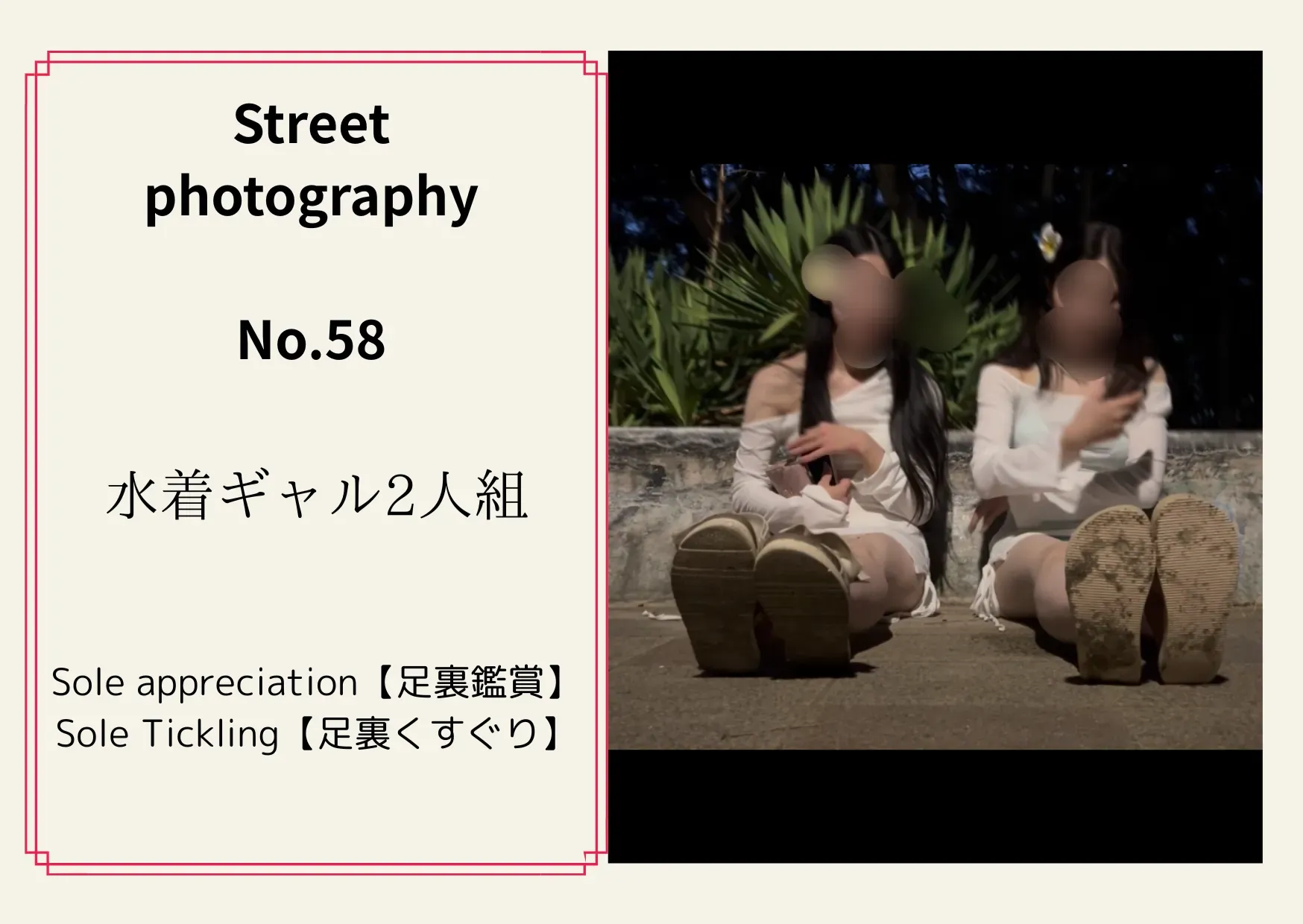 《街撮りNo.52 インスタグラマー2人組》 【足裏鑑賞と足裏くすぐり】 海にいた美人さんに声かけ二つ返事で 撮影許可をいただきそのまま撮影してきました。 左の方はこちょこちょめっちゃ弱く 撮影中に泣いてしまう始末。。。笑笑笑 美人さんが足裏くすぐりだけで泣いてしまう 問題作を早速公開します!是非、ご購入お願いいたします🤲