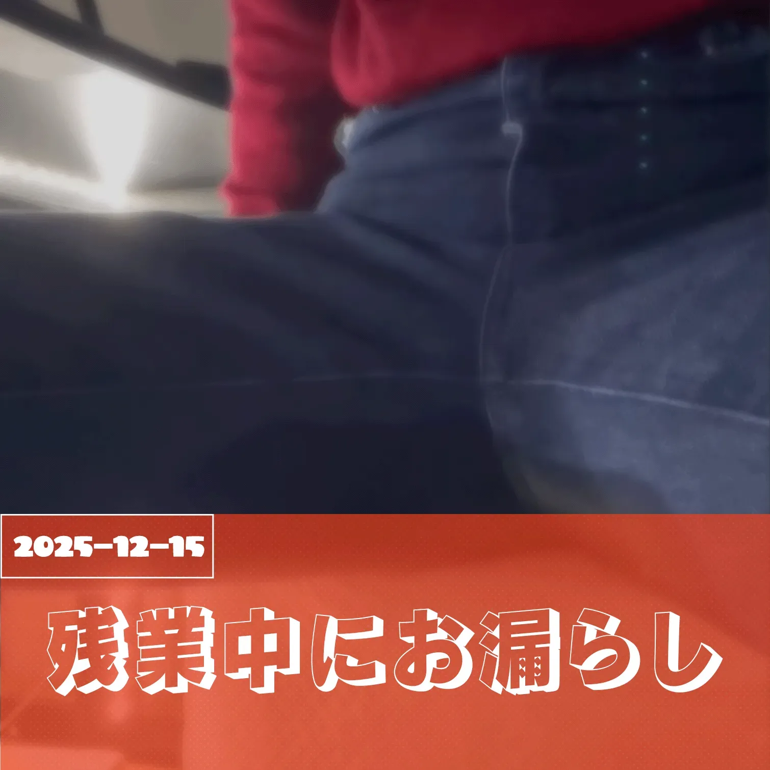2025-12-15 『残業中にお漏らししちゃった』 終わらない資料、静まり返ったオフィス。 「あと少しだから」と自分に言い聞かせて席を立てなかった。 時計の音だけがやけに大きくて、誰もいないはずなのに気配が怖い。 気づいた時には、もう遅くて―― 残業中に、誰にも言えない失敗をしてしまいました。 ------------------------------- I wet myself while working overtime. Endless paperwork, a deathly quiet office. “Just a little longer,” I told myself, unable to leave my seat. The ticking of the clock sounded unnaturally loud, and though no one should have been there, the sense of presence was terrifying. By the time I realized, it was already too late— During overtime, I made a mistake I could never tell anyone about.