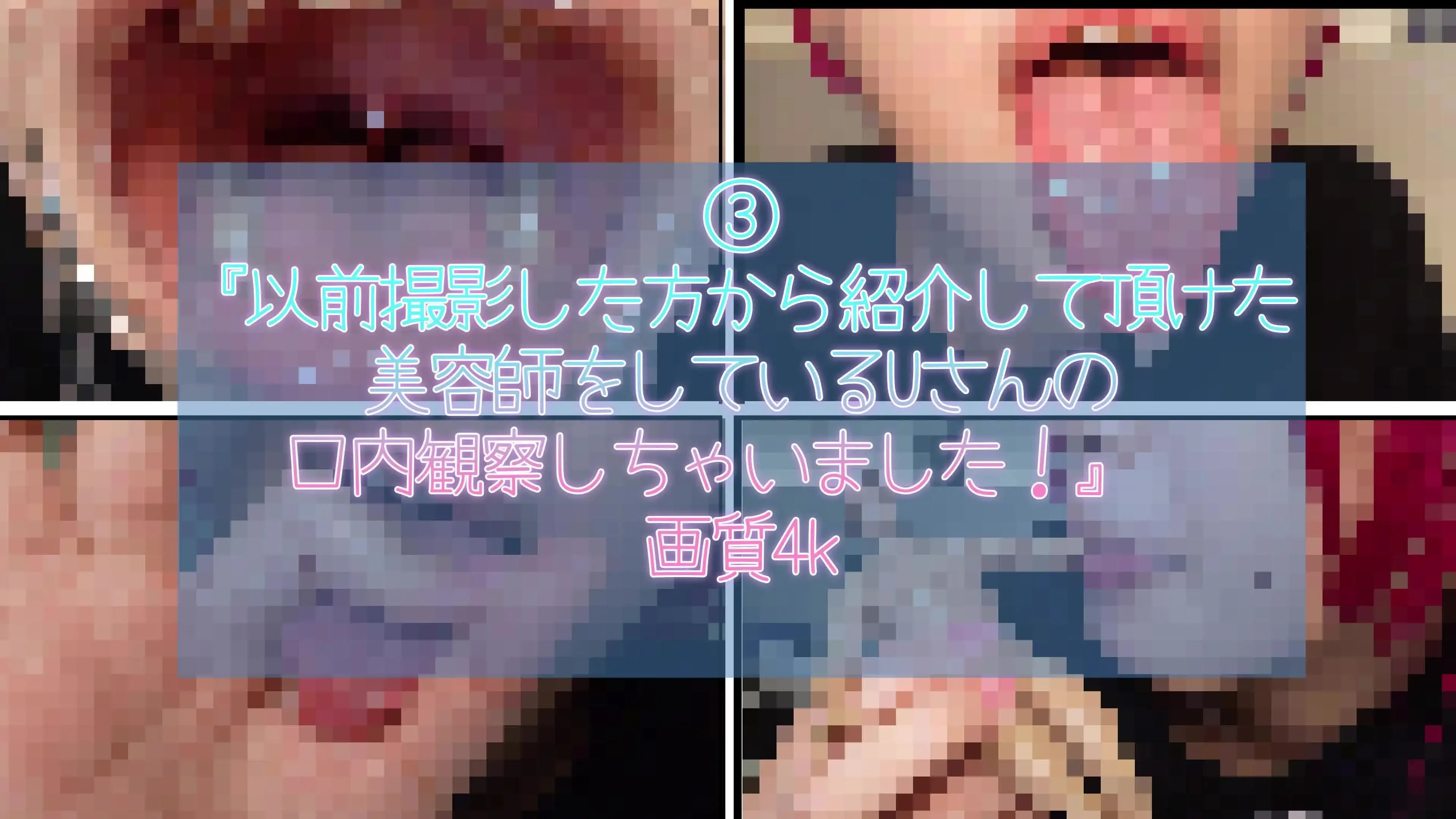 ③『以前撮影した方から紹介して頂けた美容師をしているUさんの口内観察しちゃいました!』 画質4k こちらではパート①②にも収録している口内動画も含まれてます! キュートな笑顔も可愛いUさんのベロは舌苔でほんのり汚れておりそして長いです! 恥ずかしげなく口を開き前歯の所が欠けている様子や喉ちんこまでみせてくれます! エロい口内をどうぞご覧下さい! 主な動画内容『全力ベロ出し、舌の長さ計測、エロく舌回し、舌技披露、唾液をベロから垂らす、指の間からベロ出し、開口器着用(舌出し、舌回し、歯や喉奥まで丸見え)、ねっとり指舐め、舌を絡ませて人形舐め』 モデルさん→モザイク無し